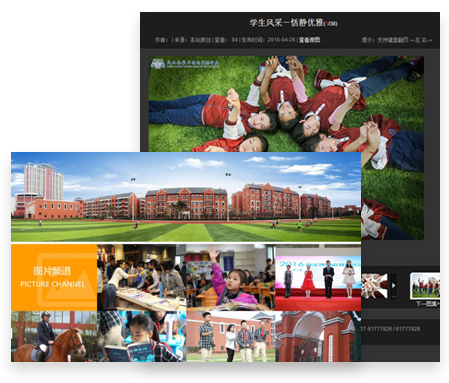 首頁(yè)首屏采用滾動(dòng)大圖的形式,展示校園環(huán)境、課堂教學(xué)等圖片內(nèi)容,不僅使網(wǎng)站界面整體上清新高雅、大氣美觀,具有強(qiáng)烈的動(dòng)態(tài)美感,而且大圖作為網(wǎng)站的一種有效的宣傳方式,作為網(wǎng)站的直接視覺(jué)元素,可以有效地吸引用戶的注意力,突出學(xué)?,F(xiàn)代化、國(guó)際化學(xué)校辦學(xué)特色。