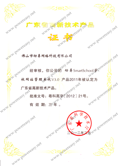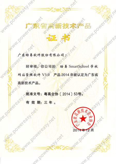 廣東省自主創(chuàng)新產(chǎn)品認(rèn)定證書(shū) 動(dòng)易SmartSchool V3.0