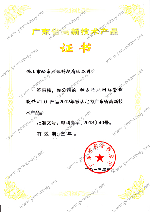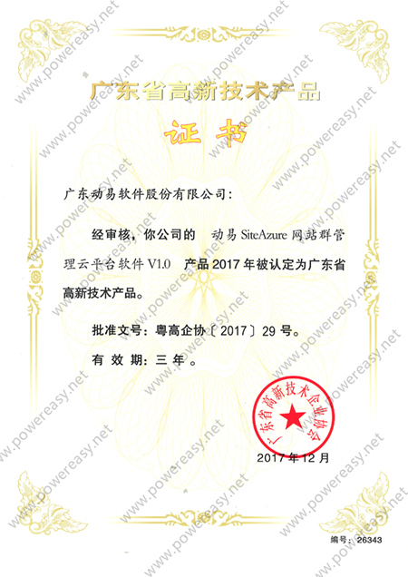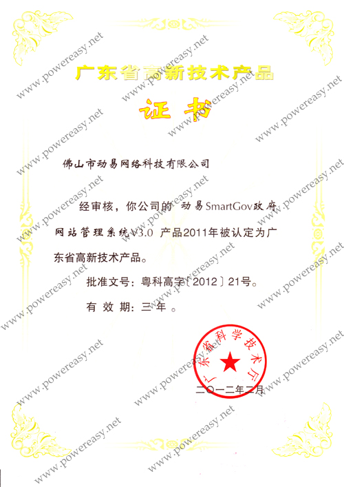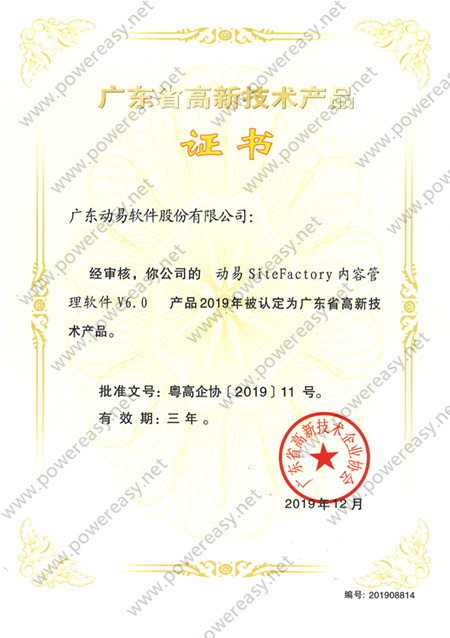 廣東省自主創(chuàng)新產(chǎn)品認(rèn)定證書(shū) 動(dòng)易SiteFactory V3.0