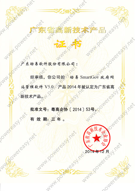 廣東省自主創(chuàng)新產(chǎn)品認(rèn)定證書(shū) 動(dòng)易SmartGov V3.0