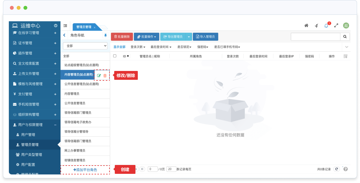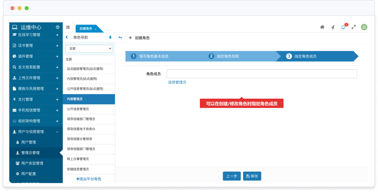 可以在創(chuàng)建/修改角色時(shí)指定角色成員,或者在管理員管理時(shí)設(shè)置管理員的權(quán)限(所屬角色)。