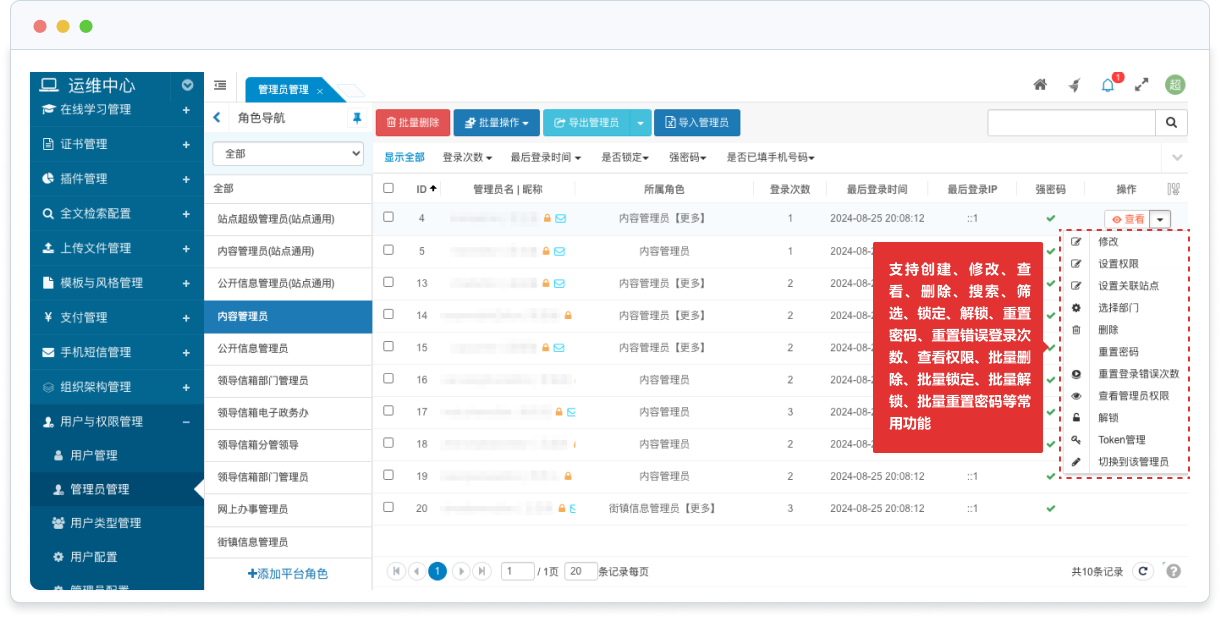 支持創(chuàng)建、修改、查看、刪除、搜索、篩選、鎖定、解鎖、重置密碼、重置錯(cuò)誤登錄次數(shù)、查看權(quán)限、批量刪除、批量鎖定、批量解鎖、批量重置密碼等常用功能;
