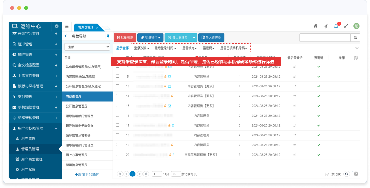 支持按登錄次數(shù)、最后登錄時(shí)間、是否鎖定、是否已經(jīng)填寫(xiě)手機(jī)號(hào)碼等條件進(jìn)行篩選;