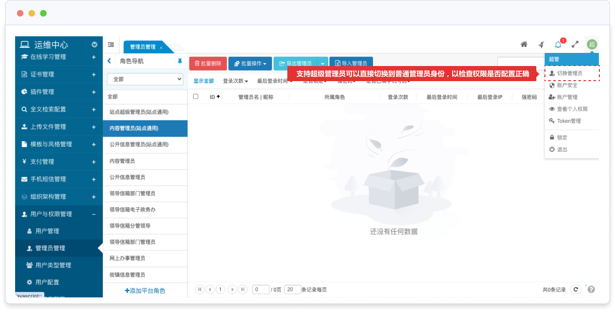 支持超級(jí)管理員可以直接切換到普通管理員身份,以檢查權(quán)限是否配置正確;