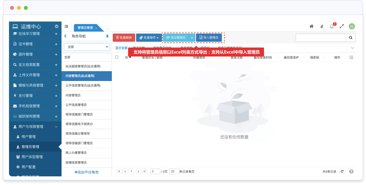 支持將管理員信息以Excel列表方式導(dǎo)出;支持從Excel中導(dǎo)入管理員。