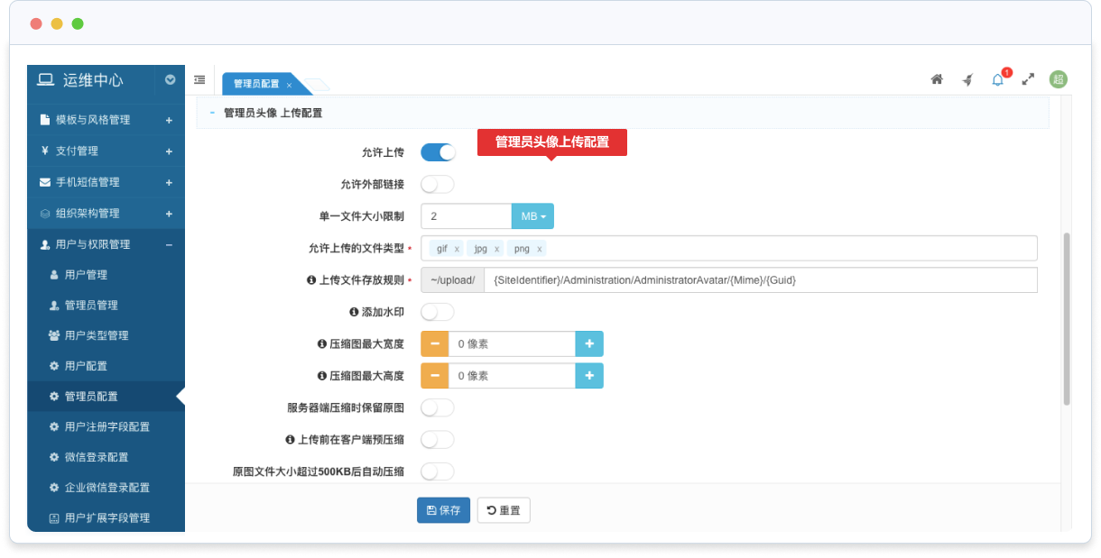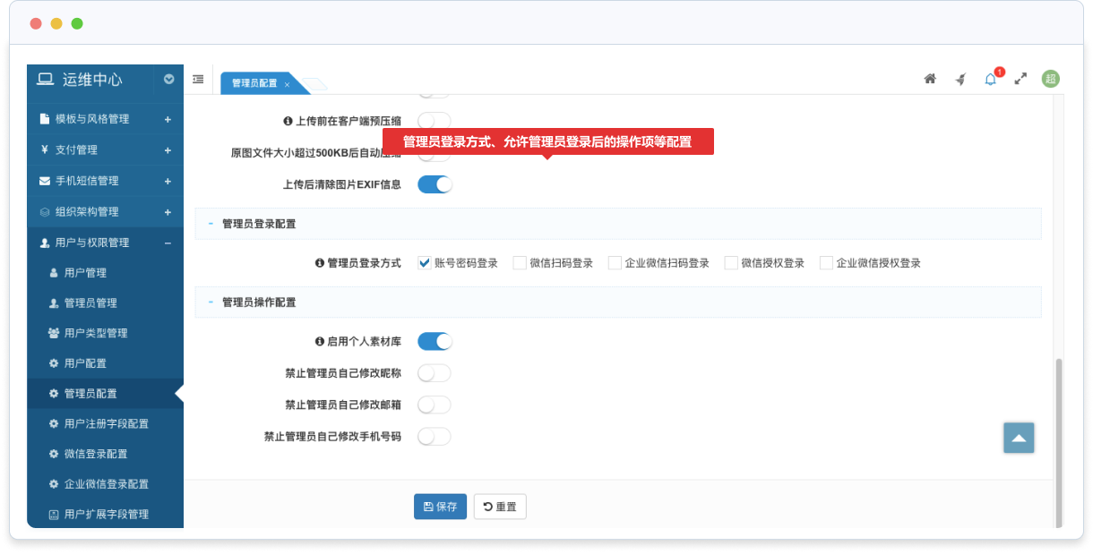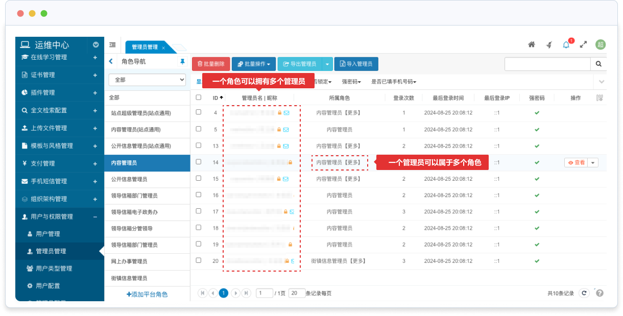 支持對(duì)角色分配權(quán)限,管理員通過(guò)所屬角色來(lái)獲得角色擁有的操作權(quán)限。一個(gè)角色可以擁有多個(gè)管理員,一個(gè)管理員可以屬于多個(gè)角色。