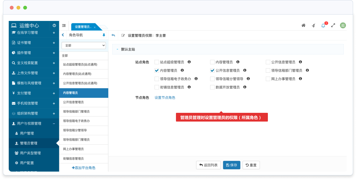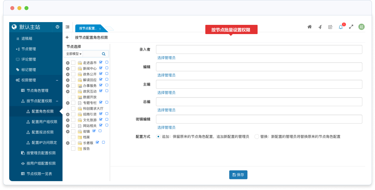 - 通過(guò)配置各欄目(節(jié)點(diǎn))節(jié)點(diǎn)角色的管理員,可以為不同欄目指派特定管理員進(jìn)行管理