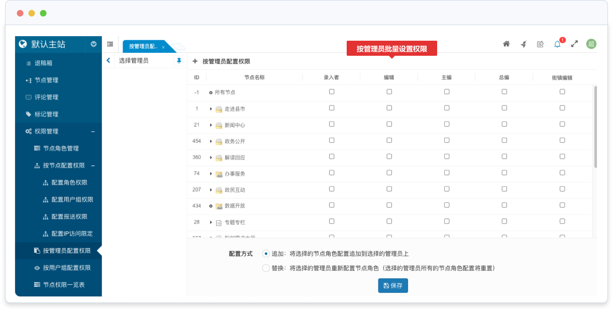 節(jié)點(diǎn)角色的權(quán)限分配支持兩種批量操作方式:按節(jié)點(diǎn)批量設(shè)置權(quán)限和按管理員批量設(shè)置權(quán)限。按節(jié)點(diǎn)批量設(shè)置權(quán)限是指可以批量添加或替換指定節(jié)點(diǎn)的各節(jié)點(diǎn)角色的管理員;按管理員批量設(shè)置權(quán)限是指可以批量添加或替換指定管理員在各節(jié)點(diǎn)中的節(jié)點(diǎn)角色。
