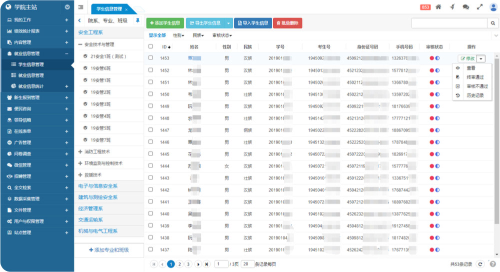 此外,班主任(輔導(dǎo)員)登錄系統(tǒng)后可查看其負(fù)責(zé)的班級(jí)信息,查看、修改、審核畢業(yè)生的就業(yè)信息。