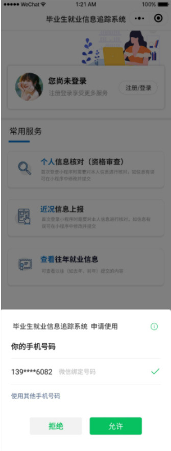 學(xué)?;虬嘀魅卫梦⑿湃旱榷喾N渠道發(fā)布填報(bào)通知,畢業(yè)生接獲通知后,通過掃描通知中二維碼快速進(jìn)入小程序。小程序自動(dòng)申請(qǐng)獲取當(dāng)前微信賬戶關(guān)聯(lián)的手機(jī)號(hào)信息,并與畢業(yè)生數(shù)據(jù)庫(kù)進(jìn)行精準(zhǔn)匹配: