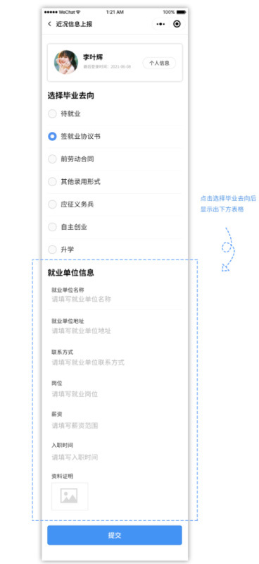 畢業(yè)生根據(jù)自身實(shí)際情況,在小程序中選擇當(dāng)前狀態(tài)(待就業(yè)、簽就業(yè)協(xié)議書、簽勞動(dòng)合同、其他錄用形式、應(yīng)征義務(wù)兵、自主創(chuàng)業(yè)、升學(xué)),小程序根據(jù)所選狀態(tài)提供不同的表單、選項(xiàng)供畢業(yè)生填寫。