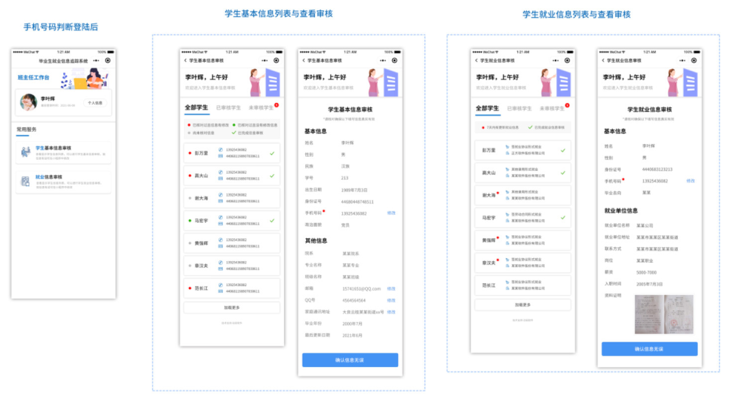 班主任(輔導(dǎo)員)掃碼進(jìn)入小程序,小程序自動(dòng)申請(qǐng)獲取當(dāng)前微信賬號(hào)綁定的手機(jī)號(hào)進(jìn)行身份驗(yàn)證,識(shí)別并確認(rèn)班主任身份后,直接進(jìn)入班主任工作臺(tái)界面,班主任能夠進(jìn)行學(xué)生基本信息與就業(yè)信息的審核工作。