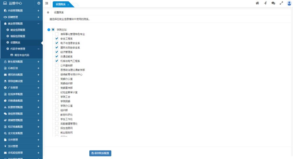 院系為全局部門的子集,可以配置全局部門中在就業(yè)信息管理模塊中啟用的部門做為院系。