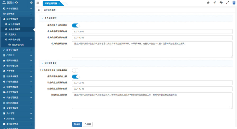 支持設(shè)置是否開放信息上報(bào)、信息上報(bào)的開始時(shí)間、截止時(shí)間、信息上報(bào)小程序中的指南性文字描述等內(nèi)容。
