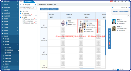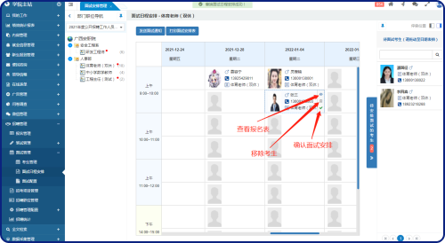 中欄為本次招生考試項(xiàng)目的班級列表,每個(gè)班級名稱后顯示相應(yīng)的進(jìn)入面試流程的考生總數(shù),假如有“待安排面試時(shí)間”的考生,則用紅點(diǎn)進(jìn)行提醒。右側(cè)為待安排面試考生列表,中間為面試日程安排表。