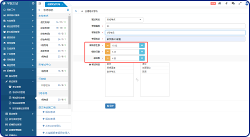設(shè)置科目名稱、適用班級(多選)、開始考試時(shí)間,結(jié)束考試時(shí)間、滿分、及格分。每次招生考試項(xiàng)目的筆試科目可能并不一樣,每次添加的考試科目默認(rèn)屬于當(dāng)前招生考試項(xiàng)目。