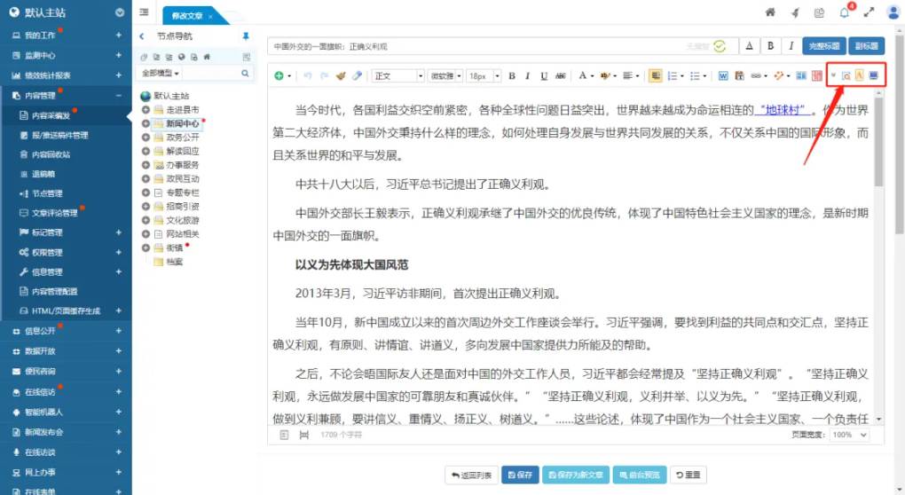 系統(tǒng)支持錯(cuò)別字和敏感詞的檢查功能。當(dāng)發(fā)現(xiàn)錯(cuò)別字或者敏感字時(shí),點(diǎn)擊結(jié)果時(shí)會(huì)自動(dòng)定位到編輯器中的具體位置,并將其標(biāo)注出來(lái)。編輯人員可以手動(dòng)確認(rèn),確認(rèn)是錯(cuò)別字和敏感字時(shí)可點(diǎn)擊“更正”按鈕由系統(tǒng)自動(dòng)修正這些錯(cuò)誤。