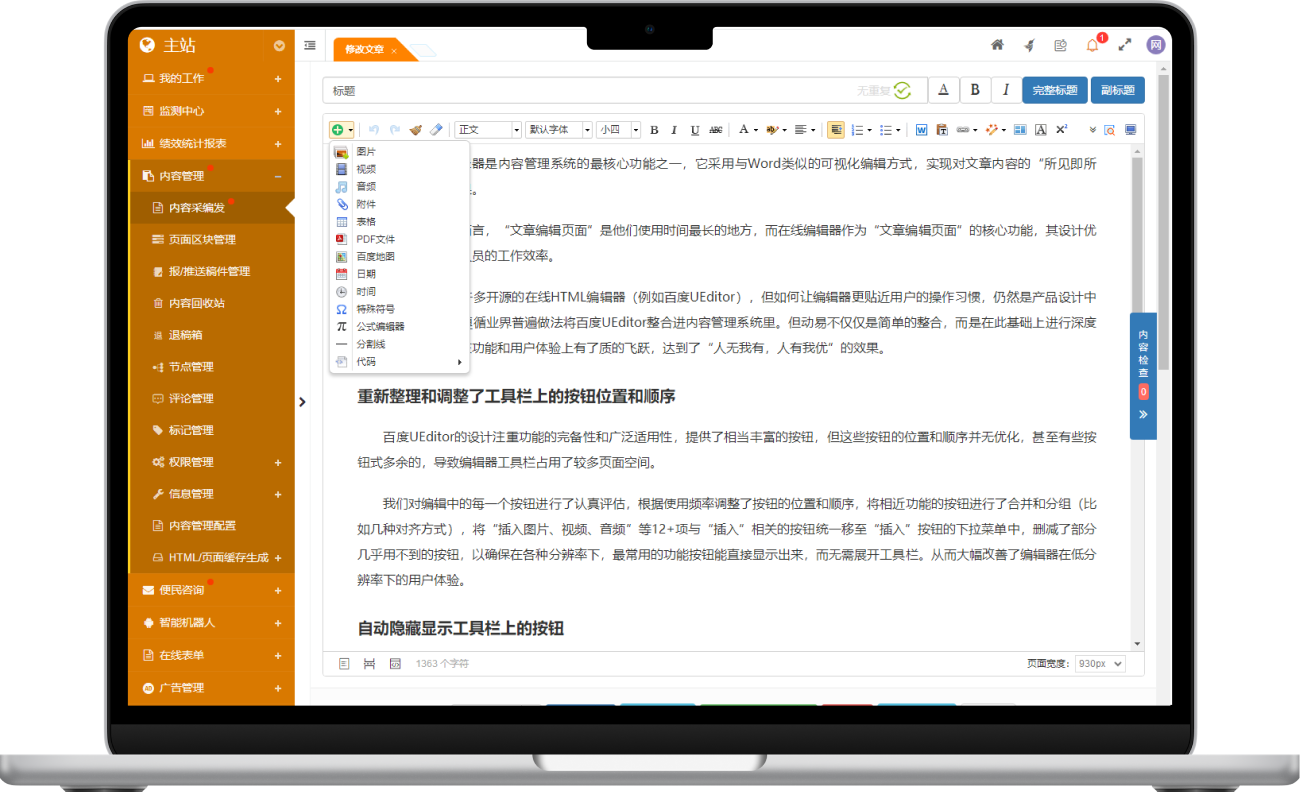 基于 UEditor 深度優(yōu)化,采用類(lèi) Word 可視化編輯方式、全面適配多設(shè)備,讓內(nèi)容編輯更輕松。