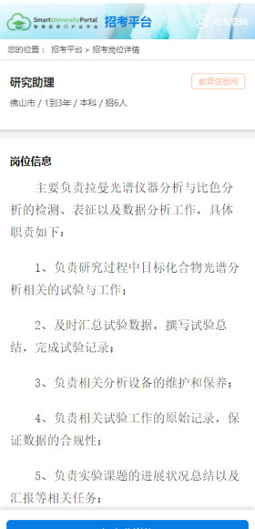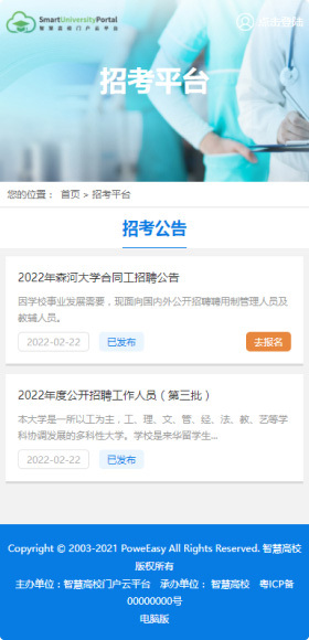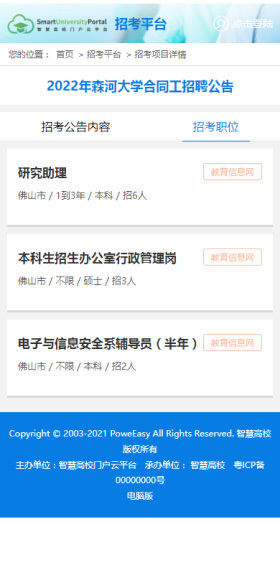前臺支持顯示招考項目列表,用戶可以點擊項目名稱查看詳細信息,并在項目詳情頁中查看相關(guān)的招聘崗位列表。點擊崗位名稱后,可查看該崗位的詳細信息。
