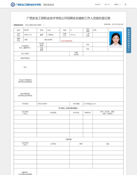 事業(yè)單位招考的報名表通常具有特定格式,與常規(guī)招聘簡歷差異顯著??紤]到招考負責人和相關(guān)領(lǐng)導已習慣紙質(zhì)報名表的樣式,我們特別設(shè)計了高度仿真的報名表填寫和查看界面,確保用戶體驗的一致性。
