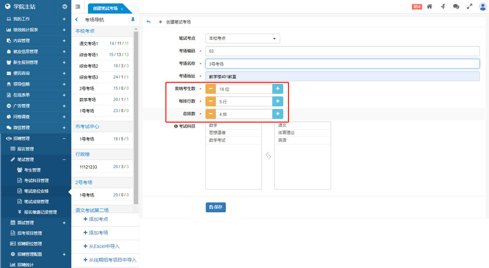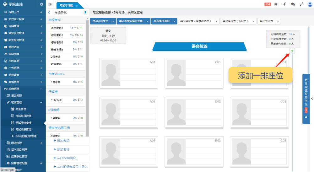 考點和考場的管理功能集成在“筆試座位安排”的考場導航中欄,無需單獨的管理菜單。