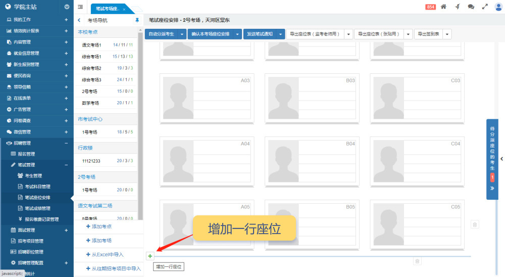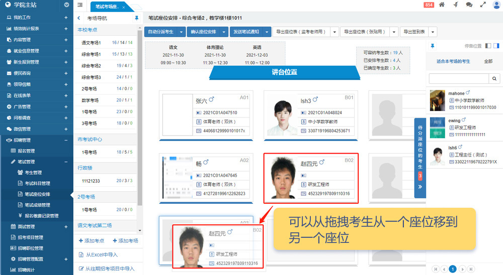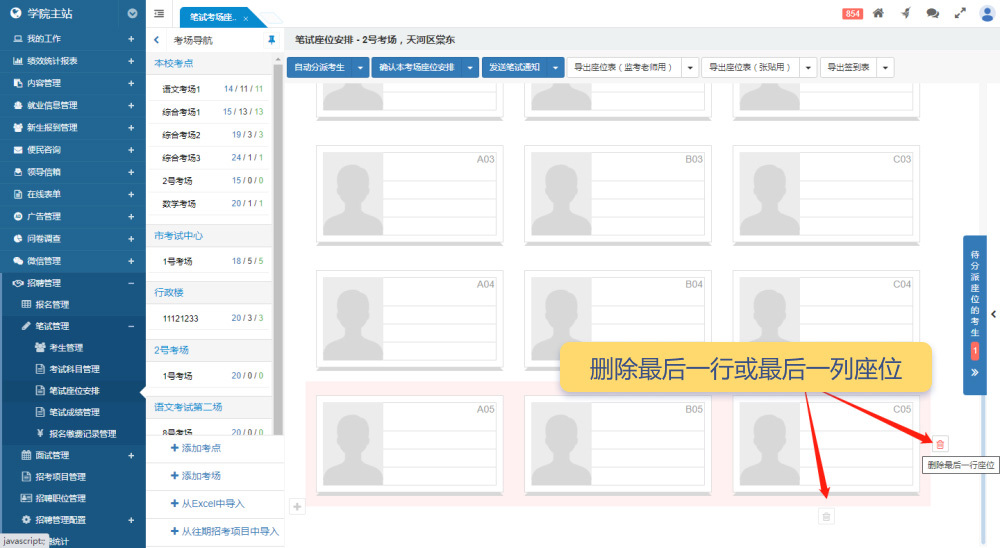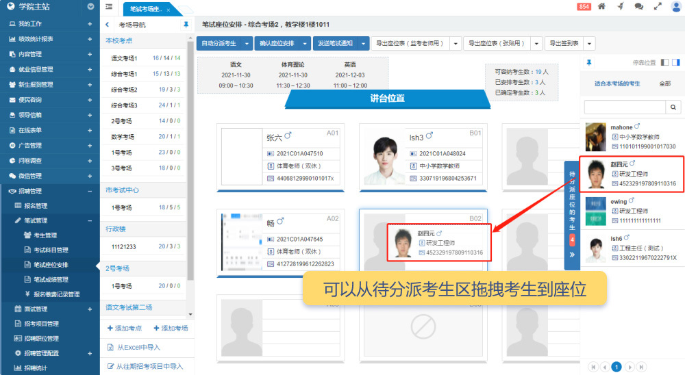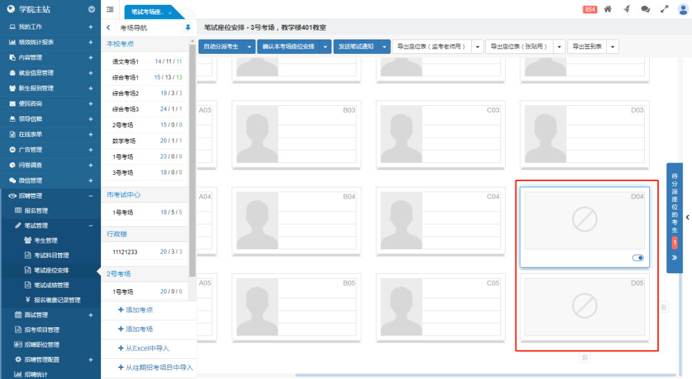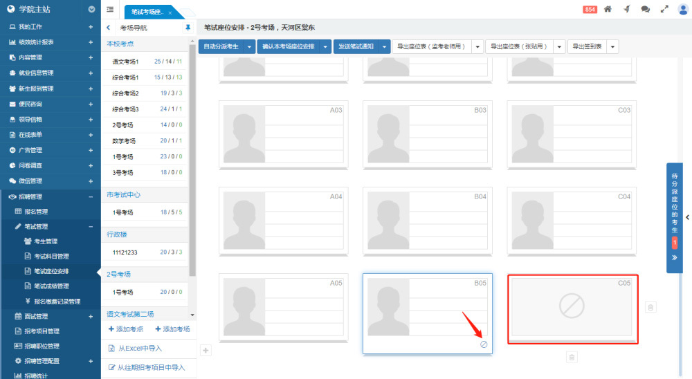 筆試考生管理界面類似于報名管理界面,中欄顯示本次招考項目的職位列表,每個職位后面顯示進入筆試流程的考生總數(shù)。如果有“待安排座位”的考生,會有紅點進行提醒。中欄頂部支持切換不同的招考項目。