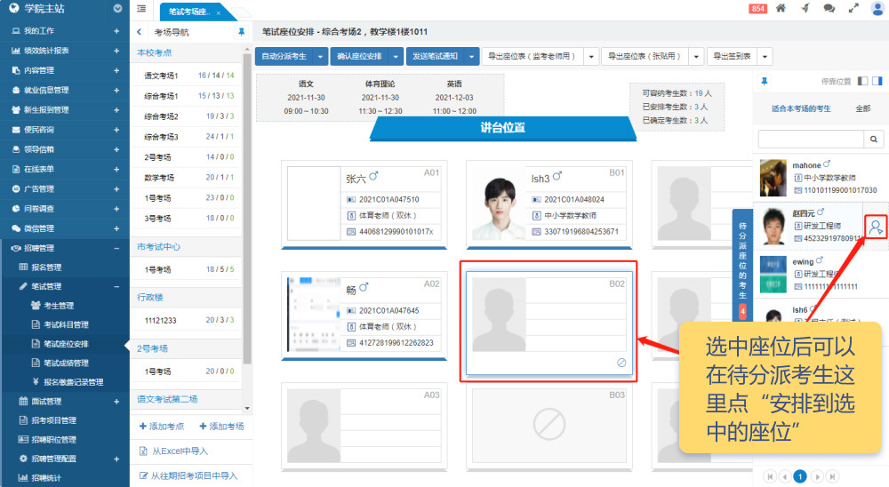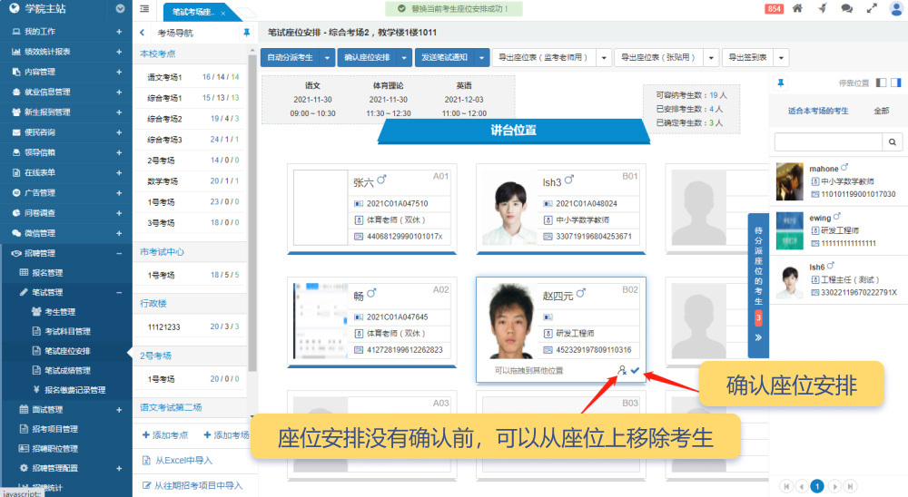 在后臺管理界面中,中欄顯示考點和考場導航信息。右側(cè)展示座位安排表,以所見即所得的方式顯示每個座位的考生信息。同時,右側(cè)還包含“待分派座位的考生”區(qū)域(僅在有待分派考生時顯示)。