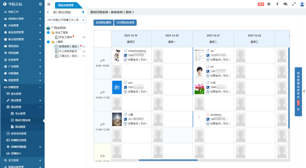 系統(tǒng)的中欄顯示本次招考項目的職位列表,每個職位名稱后標注進入面試流程的考生總數(shù)。若有“待安排面試時間”的考生,系統(tǒng)會以紅點提示。右側(cè)顯示待安排面試的考生列表,中間則為面試日程安排表。