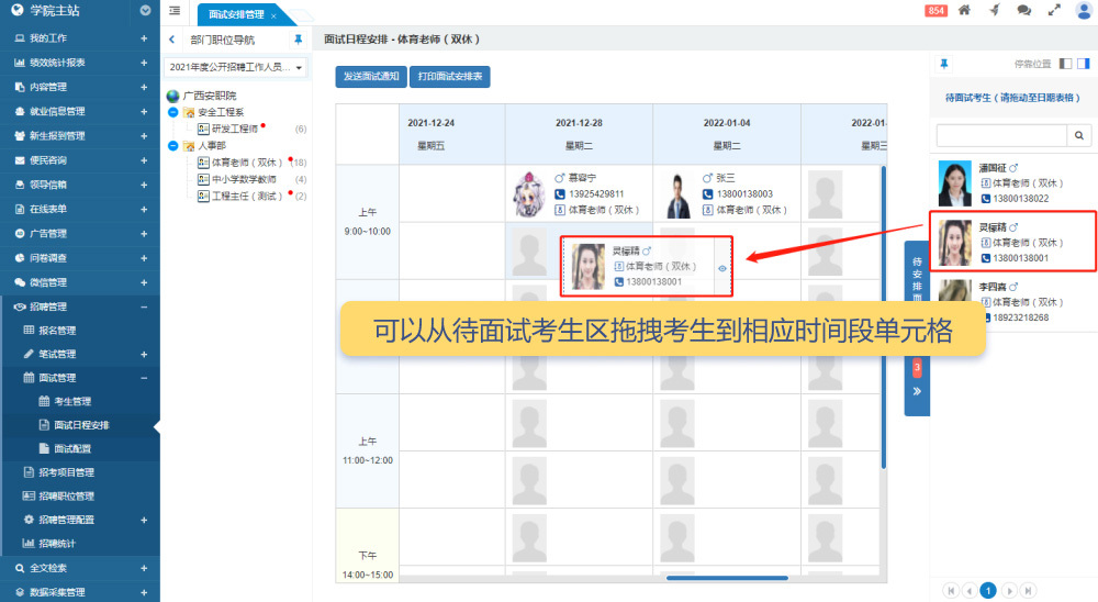面試日程安排表的列為指定的招聘日期,行為面試時間段,每個單元格顯示該時間段的已安排面試考生及其報考崗位。點擊左側(cè)的招聘崗位,表格將篩選出該崗位已安排面試的考生;點擊右側(cè)的“待安排考生”,表格則篩選出該考生對應(yīng)崗位的已安排考生。用戶可以將“待安排考生”拖拽到未安排面試的時間段,也可以在不同時間段間拖動考生。若一個時間段內(nèi)有多個考生,還可通過拖拽調(diào)整順序。已安排好的考生可隨時移除以重新安排。