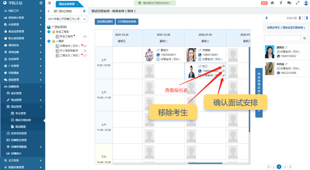 系統(tǒng)還支持確認面試安排、發(fā)送面試通知、打印面試日程安排表等操作。