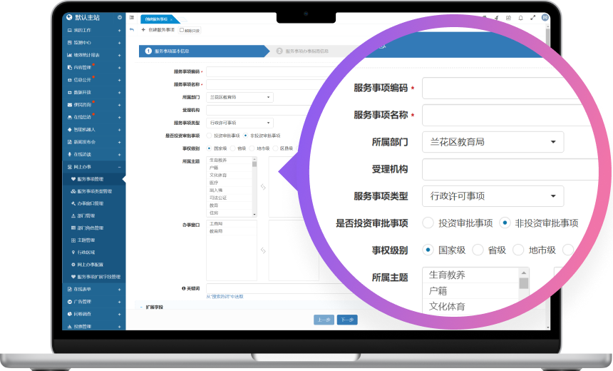 該系統(tǒng)集成了多個核心功能子模塊,包括服務(wù)事項管理、辦事窗口管理、部門管理、主題管理、行政區(qū)域管理等功能子模塊。
