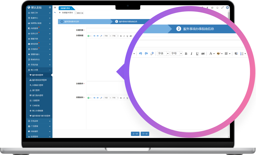 網(wǎng)上辦事系統(tǒng)主要用于在網(wǎng)站群平臺展示并處理各類行政審批服務(wù)事項,為用戶提供一個便捷的在線服務(wù)平臺。