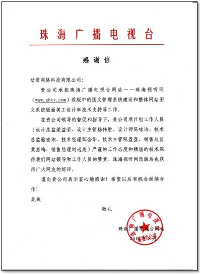 【動(dòng)易8月12日訊】近日,動(dòng)易公司收到客戶珠海電視臺(tái)發(fā)來的一封熱情誠懇的感謝信,信中表達(dá)了其對(duì)動(dòng)易公司承建珠海廣播電視臺(tái)媒體新門戶——“珠海視聽網(wǎng)”工作的充分肯定。