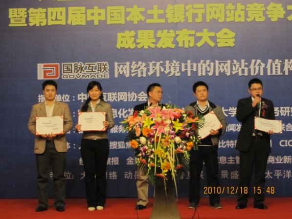 2010年12月18日,由中國互聯(lián)網(wǎng)協(xié)會為指導,國脈信息化發(fā)展研究中心和浙江大學電子服務研究中心聯(lián)合主辦的的“大型企業(yè)門戶網(wǎng)站發(fā)展戰(zhàn)略研討暨第四屆中國本土銀行網(wǎng)站競爭力研究成果發(fā)布會” 在北京隆重召開,會議隆重發(fā)布《本土銀行網(wǎng)站競爭力發(fā)展研究報告》和第四屆本土銀行網(wǎng)站競爭力排名評選結果,并現(xiàn)場為獲獎單位頒獎。動易作為國內網(wǎng)站建設優(yōu)秀解決方案提供商應,成功獲得“優(yōu)秀企業(yè)站群協(xié)同解決方案”獎項!