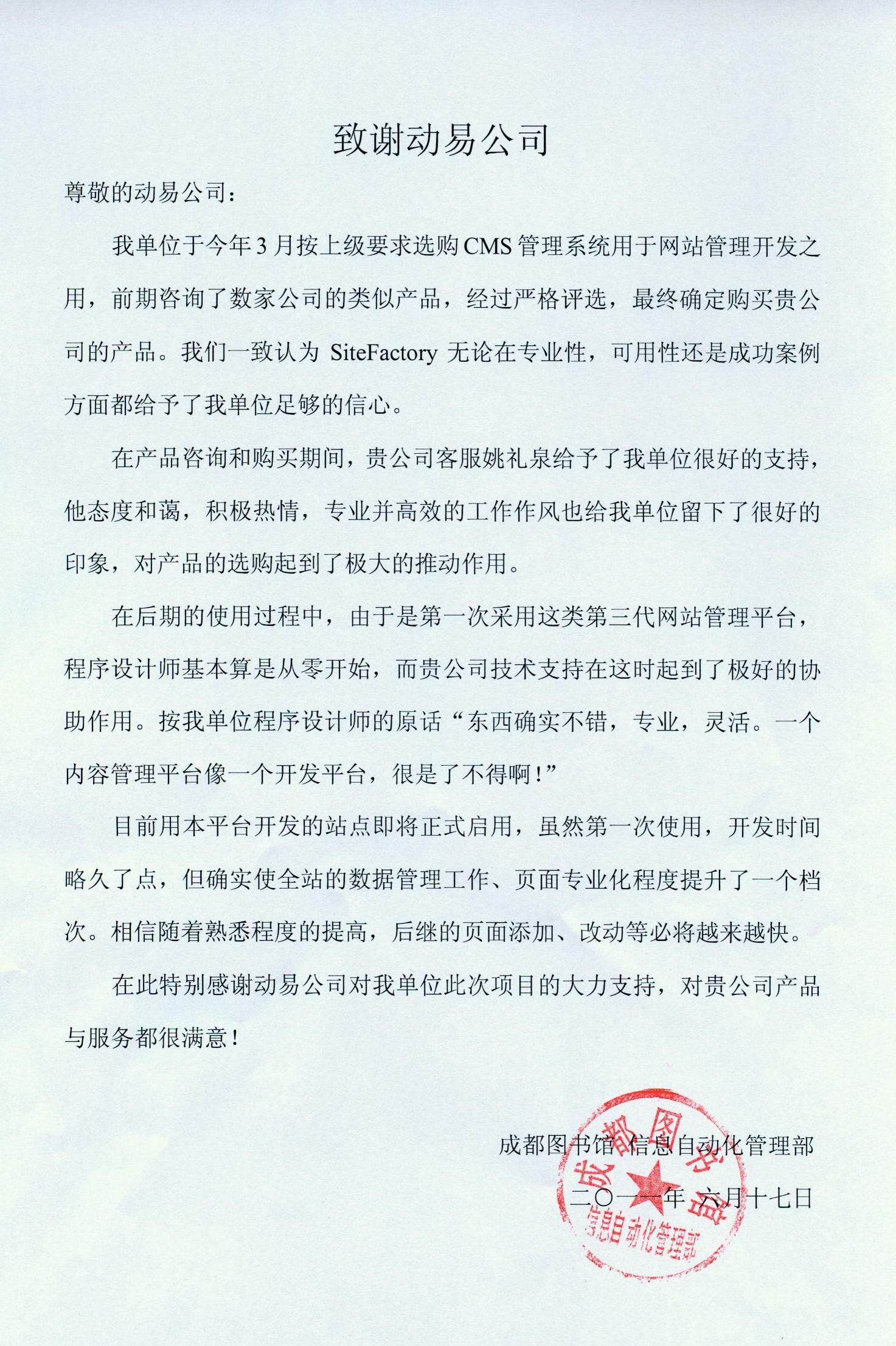 二零一一年六月十七日,動易公司收到一封來自成都圖書館發(fā)來的感謝信,客戶在信中充分表達了對動易客服姚禮泉和技術支持人員的深深謝意,同時也對動易產(chǎn)品做出了很高的評價。