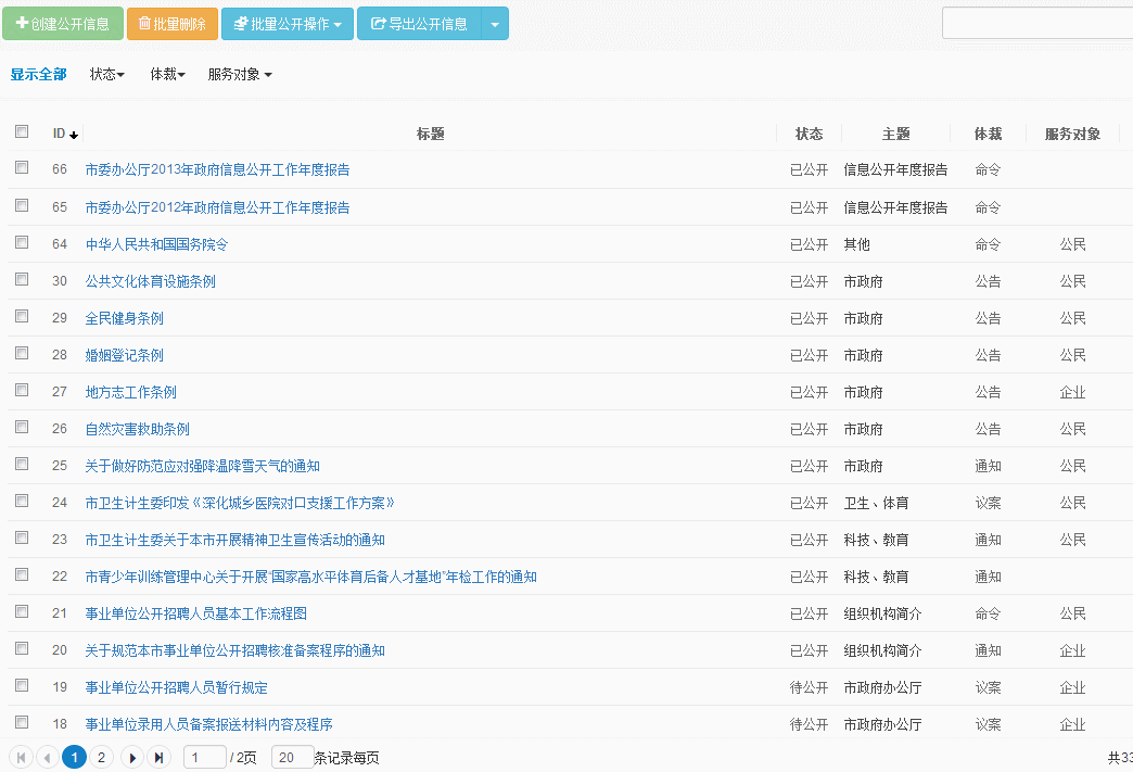 ● 列表頁的快捷排序功能。鼠標單擊列表上方“標題”、“審核狀態(tài)”“發(fā)布時間”即可進行相應列表的信息快捷排序。單擊“標題”按首字符排序信息,單擊“審核狀態(tài)”按文章狀態(tài)分類排序信息。單擊“發(fā)布時間”按時間順序進行排序信息。