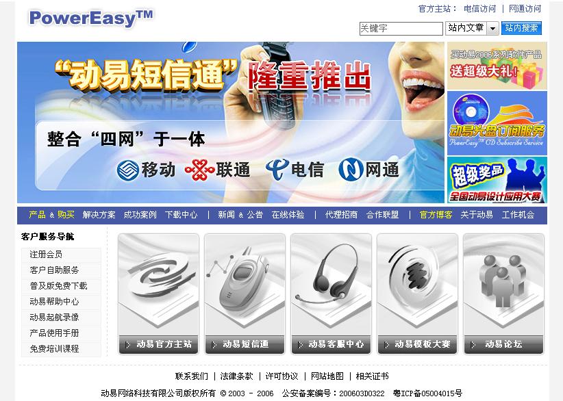 新的導(dǎo)航首頁(yè)的設(shè)計(jì)更加符合瀏覽者的使用習(xí)慣,文字菜單部分更加清晰明了,同時(shí)采用了較多的圖片按鈕作為特色功能的入口,將更加方便瀏覽者尋找自己所需要的網(wǎng)站資訊內(nèi)容。導(dǎo)航頁(yè)面還特別設(shè)計(jì)了客戶服務(wù)導(dǎo)航的快速功能鏈接,以引導(dǎo)用戶迅速明確的使用動(dòng)易產(chǎn)品。