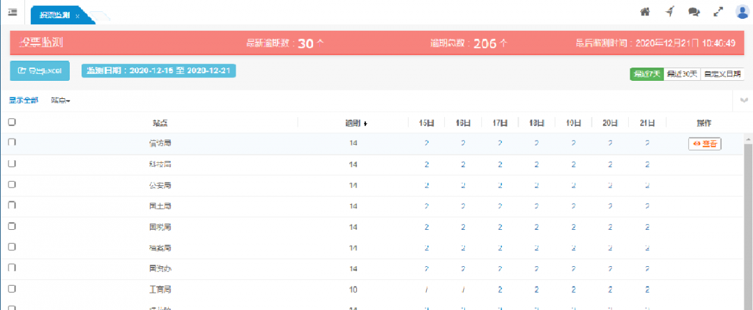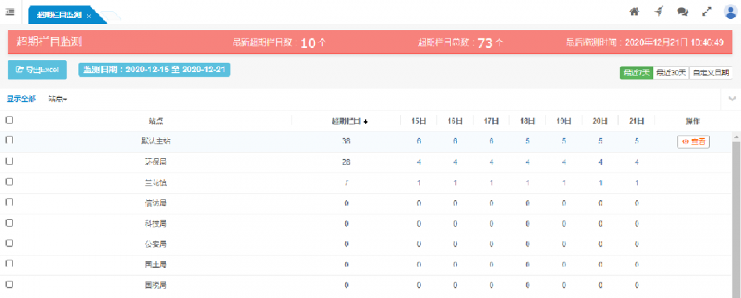 按站點(diǎn)顯示各站點(diǎn)的超期欄目監(jiān)測(cè)情況。