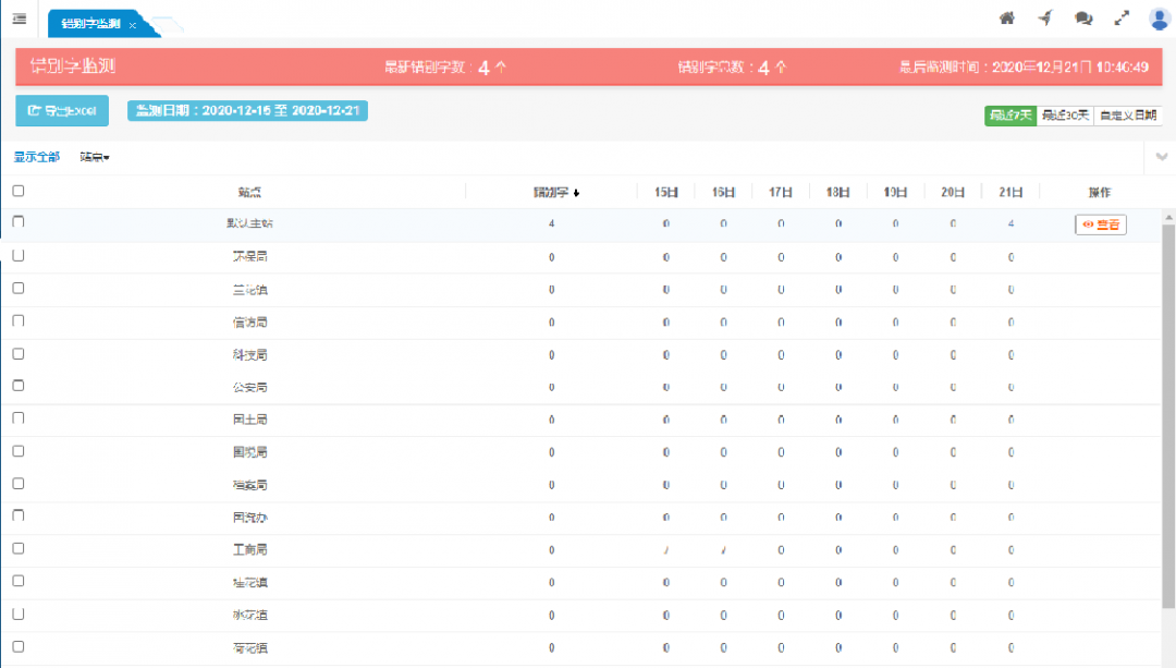 按站點(diǎn)顯示各站點(diǎn)的錯(cuò)別字監(jiān)測(cè)情況。