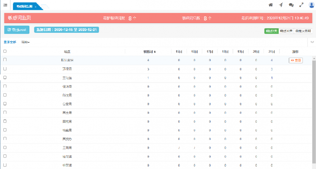 按站點(diǎn)顯示各站點(diǎn)的敏感詞監(jiān)測(cè)情況。