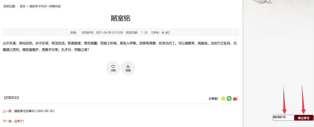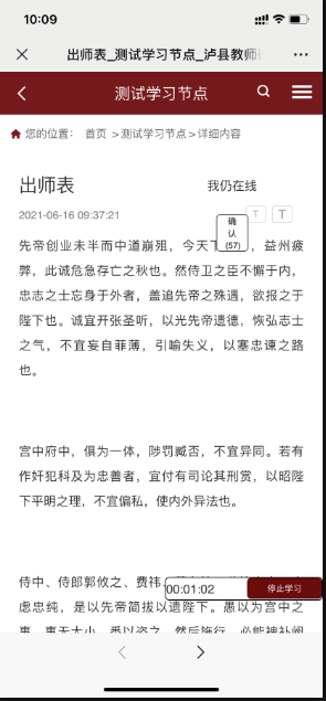 學習者學習文章、視頻等學習資源時,平臺會會顯示一個學習時長計時器,顯示已經(jīng)學習了多久時間。如果用戶長時間不動頁面,系統(tǒng)則會彈窗要求手動點擊按鈕,以確認用戶是否還在屏幕前學習。