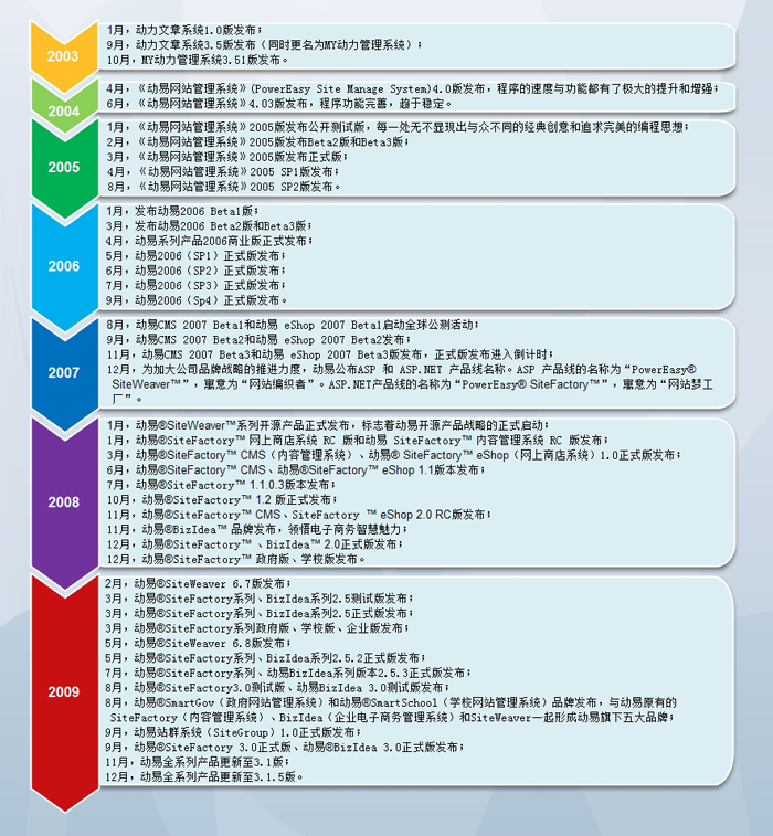 回望一路走來的七個年頭,從最初的動力文章1.0版,到現(xiàn)在的全系列產(chǎn)品3.1.6版,動易產(chǎn)品歷經(jīng)了上百次大小版本的發(fā)布,而秉持著“精益求精”的研發(fā)理念,動易產(chǎn)品也進(jìn)行了數(shù)次的改革和創(chuàng)新: