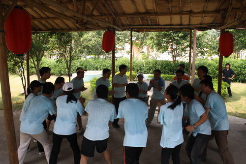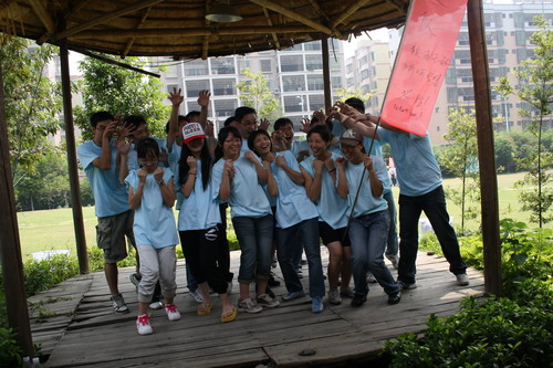 活動(dòng)的第一天9月20日是星期天,大家個(gè)個(gè)精神抖擻,很早就到了公司集合。上車(chē)后大家笑笑鬧鬧,一路飛歌,早上9點(diǎn)多就到了目的地。在換好拓展公司統(tǒng)一發(fā)放的T恤并做了幾個(gè)熱身的小活動(dòng)后,大家就開(kāi)始進(jìn)入第一天活動(dòng)的準(zhǔn)備階段---建立團(tuán)隊(duì)。所有人按照?qǐng)?bào)號(hào)的順序分成了四隊(duì)后,就分組去開(kāi)始討論自己的隊(duì)名、口號(hào)和隊(duì)歌。我被分到了第一隊(duì),福娃自告奮勇當(dāng)了隊(duì)長(zhǎng),因?yàn)榇蠹移綍r(shí)喜歡叫他雷娃,所以我們的隊(duì)名很順理成章就叫了“雷隊(duì)”,口號(hào)就是“雷!很雷!非常雷!”,之后也不知道誰(shuí)的提議,隊(duì)歌就用了“妹妹你坐船頭,哥哥在岸上走,恩恩愛(ài)愛(ài)纖繩蕩悠悠……”這幾句,于是乎無(wú)比響亮的一句口號(hào)配上了相當(dāng)軟綿綿的幾句歌詞,倒也頗顯我們隊(duì)剛?cè)岵?jì)的特色。其他幾的隊(duì)隊(duì)名、風(fēng)格各異,有叫十八羅漢隊(duì)的,有叫野狼隊(duì),更有甚者叫劍人隊(duì)(此“劍”還是彼“賤”?大家可自由聯(lián)想)。我們隊(duì)的人員相當(dāng)齊心,在第一輪的展示和團(tuán)隊(duì)小游戲中就拿了第一個(gè)高分,當(dāng)然這是后話。