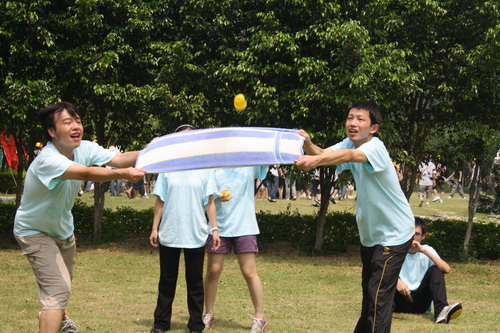 第一個(gè)正式的拓展項(xiàng)目名稱(chēng)叫做“南水北調(diào)”,玩法是各組每2人站成一對(duì),每對(duì)人手上拿一塊毛巾,每組分配有30個(gè)汽球全部裝好水,將水球放到毛巾上,每次一個(gè)由各隊(duì)成員依次以接龍形式從第一對(duì)隊(duì)員手中的毛巾上傳送到最后一對(duì)隊(duì)員手里的毛巾上,最后把水球送到終點(diǎn)的桶里,拿到最多水球的隊(duì)伍可得最高分。初聽(tīng)說(shuō)明時(shí)貌似這個(gè)游戲很簡(jiǎn)單,到真正進(jìn)行時(shí)才發(fā)現(xiàn)遠(yuǎn)遠(yuǎn)不是想象中那么容易:因?yàn)槊繉?duì)隊(duì)員相距好幾米遠(yuǎn),要利用毛巾的彈力將水球準(zhǔn)確無(wú)誤地送到下一對(duì)隊(duì)員手中的毛巾上,兩個(gè)人的力道要配合的相當(dāng)好,用力過(guò)猛水球就飛過(guò)頭了,用力太輕水球又飛不過(guò)去,而且水球砸在地上,很容易就破掉了。所以在開(kāi)始一段時(shí)間內(nèi),我們隊(duì)毫無(wú)進(jìn)展,有時(shí)候好不容易前兩對(duì)的人員運(yùn)送成功,下一組的運(yùn)送又失敗了。不過(guò)幸好每隊(duì)安排有一個(gè)靈活撿球的“走鬼”,這下子就苦了我們隊(duì)里的小歐童鞋,他四處飛奔,不僅要撿回自己隊(duì)拋丟在地上的球,還要瞅準(zhǔn)空子去撿別隊(duì)的球,以保證我們的隊(duì)員們有更多的球可以使用,幾番下來(lái),他已經(jīng)累得滿(mǎn)頭大汗、氣喘吁吁。除了“走鬼”之外,其他人都是不可以碰球的,所以我們這些旁觀者看了只有干著急。不過(guò)到了最后,基本上已經(jīng)無(wú)法嚴(yán)格控制了,每隊(duì)都在爭(zhēng)著找球、拋球,混水摸魚(yú)者自是不在話下。到了最后幾分鐘的時(shí)間里,我們隊(duì)也不管三七二十一,只要有球就用力拋,有一次從第一對(duì)越過(guò)中間幾對(duì),直接拋到了最后一隊(duì),居然也成功了,嘿嘿,功力確實(shí)深厚,但也不得不說(shuō)頗有運(yùn)氣的成份了。