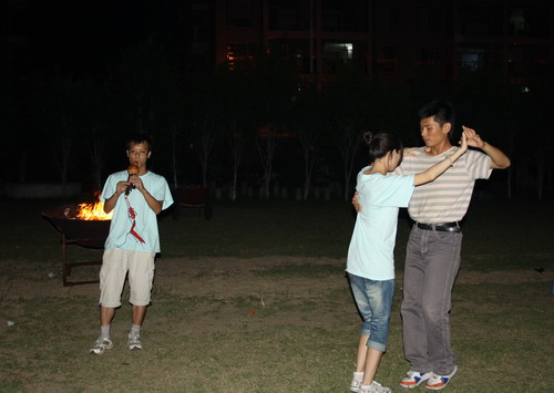 晚上的篝火晚會(huì)沒(méi)有了白天分?jǐn)?shù)的爭(zhēng)奪,大家都徹底放松了。開(kāi)場(chǎng)的一個(gè)小游戲讓大家都笑岔了氣,被抓上場(chǎng)每個(gè)人都要說(shuō)一個(gè)類(lèi)似于“紅通通”這一類(lèi)的形容詞,最后才知道這個(gè)詞是用來(lái)形容自己的PP的,于是“我的屁股綠油油”、“我的屁股香噴噴”……各種形容層出不窮,配合當(dāng)時(shí)的情境那真是有說(shuō)不出的有趣。接下來(lái)的“環(huán)保服裝秀”更是讓大家大開(kāi)眼界,沒(méi)想到短短的時(shí)間內(nèi),每個(gè)隊(duì)都做出了三套以上的衣服,而且各種設(shè)計(jì)獨(dú)特別致,遠(yuǎn)遠(yuǎn)出乎我們的意料之外。小羊的“濟(jì)公裝”配了一把漂亮的扇子,他走路的那個(gè)姿態(tài)真叫一個(gè)嫵媚;小胖的“武士裝”穿在他身上,倒頗有些中世紀(jì)武士的味道,但仔細(xì)再看看,又有些象中國(guó)古代的道人,還有大斌的“火箭裝”,劉藝的不知道叫什么名字的服裝……哈哈,精彩之處太多了,無(wú)法一一形容。輪到我們隊(duì)的兩大猛男上場(chǎng)表演的時(shí)候,阿欣超有創(chuàng)意地制造出一件世界上獨(dú)一無(wú)二的樹(shù)葉上裝,NONO為了集體的榮譽(yù)真是徹底豁出去了,索性脫了上裝“性感”上陣,我臨時(shí)做了一朵紙花,本想幫福娃戴在頭上,奈何汗流的太多,用膠帶怎么都貼不上,他索性將紙花咬在嘴里,兩人妖嬈地上場(chǎng)了,立即引起大家一片尖叫和哄笑。精彩的服裝秀環(huán)節(jié)之后,野狼隊(duì)和十八羅漢隊(duì)各出了一個(gè)小節(jié)目,靚女阿靜上場(chǎng)秀了一把歌喉,帥哥阿靖出場(chǎng)露了一手魔術(shù)。雖然我們隊(duì)不用出節(jié)目,但為了助興,我們的隊(duì)員小歐主動(dòng)亮出了自己的拿手才藝――葫蘆絲表演,從來(lái)不知道小歐的葫蘆絲吹的那么好,音樂(lè)一響起,大家已經(jīng)在瘋狂地拍手了,一曲婉轉(zhuǎn)美妙的《月光下的鳳尾竹》聽(tīng)得大家如癡如醉,我們隊(duì)的勝德和陳陳自告奮勇地上場(chǎng)翩翩起舞,一時(shí)間熊熊的篝火、悠揚(yáng)的葫蘆絲、曼妙的舞姿,在點(diǎn)點(diǎn)燈光映照的夜空下,真是一幅無(wú)比美妙的圖畫(huà)。