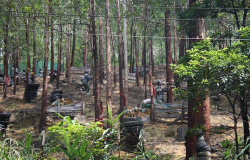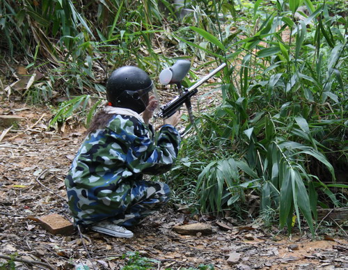 一天活動(dòng)結(jié)束后回到酒店感覺(jué)累得很,身上的衣服都是干了濕、濕了又干不知道多少遍了,沖完涼后一頭扎在舒服的床上,以為自己會(huì)很暢快地大睡一覺(jué),誰(shuí)知道一夜反反復(fù)復(fù)地醒了好幾次,半夜里響起好大的雷聲,轟隆隆地打的嚇人,好不容易熬到天亮,去餐廳吃了早餐辦理了退房手續(xù)就直接集合了。半夜下的雨讓外面的草地濕漉漉的,溫度比昨天下降了不少,在進(jìn)行了幾個(gè)熱身的小游戲之后我們就直奔今天第一個(gè)活動(dòng)的地點(diǎn)――玄真野戰(zhàn)基地。對(duì)了,忘記說(shuō)我們今天的第一個(gè)活動(dòng)是打野戰(zhàn)。我從小就崇拜軍人,想到自己也能穿上迷彩服端著槍在叢林里沖鋒陷陣,心情不由地興奮萬(wàn)分。到了野戰(zhàn)基地遠(yuǎn)遠(yuǎn)就聽(tīng)到山上有“啪啪”的槍聲,大家的情緒明顯高昂了起來(lái)。教練讓我們分成了藍(lán)、綠兩方,藍(lán)方負(fù)責(zé)守,綠方負(fù)責(zé)攻,我被分到了藍(lán)方。分好后分別去挑選衣服,藍(lán)、綠兩種衣服被亂糟糟地堆在一起,房頂上還掛了不少,不知道是洗了沒(méi)干,還是根本就是穿過(guò)后汗水濕透了沒(méi)洗,所有的衣服都是濕漉漉的,我隨便在里面挑了一套看也沒(méi)看就穿上了。集合的時(shí)候野戰(zhàn)教練問(wèn)的第一個(gè)問(wèn)題就是:有哪些人把褲子穿反了,我仔細(xì)看了下自己穿的褲子,果然把褲袋穿到后面去了,看看周?chē)拐媸怯胁簧偃硕挤噶诉@個(gè)錯(cuò)誤,看來(lái)我們離軍人的要求還真差的不是一般的遠(yuǎn),嘿嘿,反正上裝肥大得很,將褲子都籠住了半截,我們也就懶得去糾正這個(gè)錯(cuò)誤了。