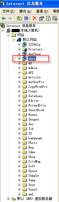 再一想,所有鏈接地址什么的都正確,只有圖片不顯示,會不會是找不到Skin這個(gè)目錄?或是打開他的Internet 信息服務(wù),查看網(wǎng)站中的設(shè)置,發(fā)現(xiàn)了默認(rèn)網(wǎng)站中多了個(gè)“Skin”虛擬目錄(下圖所示),這就是罪魁禍?zhǔn)祝涸L問時(shí)系統(tǒng)因?yàn)榇嬖诹送奶摂M目錄,即訪問時(shí)當(dāng)作訪問虛擬目錄的方式進(jìn)行,與網(wǎng)站的Skin目錄相沖突了。刪除了這個(gè)“Skin”虛擬目錄后,一切恢復(fù)正常。