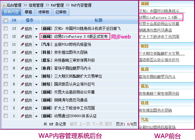 ?。?nbsp;WAP內(nèi)容可控:可單獨(dú)進(jìn)行添加、刪除等管理,也可手動(dòng)同步Web內(nèi)容(獲取內(nèi)容模型中的信息即可);