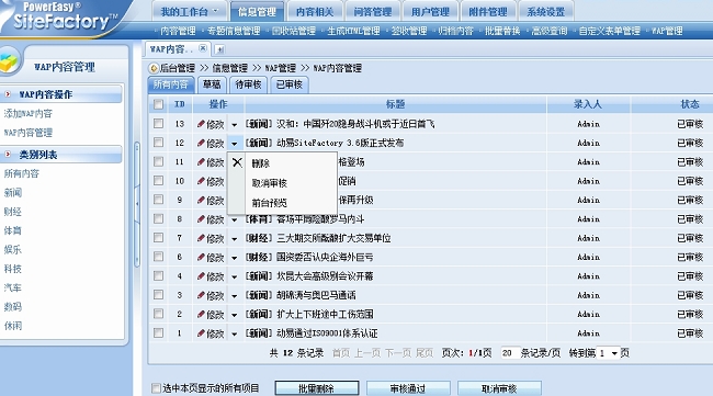 從下圖中可以看到,WAP內(nèi)容管理里有添加、刪除、審核及前臺(tái)預(yù)覽功能。