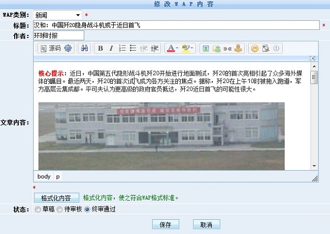 部分用戶在添加信息時(shí)習(xí)慣直接從Word文檔或網(wǎng)上直接復(fù)制內(nèi)容,這樣會(huì)導(dǎo)致用手持設(shè)備瀏覽網(wǎng)站時(shí)格式出錯(cuò)。還有我們發(fā)布信息時(shí)經(jīng)常要發(fā)布圖片,特別是同步信息模型的時(shí)候,原文中的圖片往往是大尺寸,而WAP的圖片只能是小尺寸,如果每張圖片都要修改大小再重新上傳會(huì)是一件十分麻煩的事。
